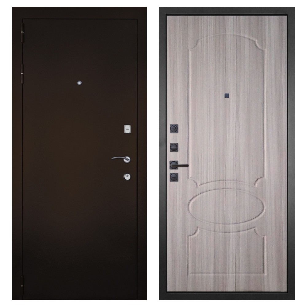 Эстетика и долговечность: Полимерно-порошковое покрытие в цвете «Антик-Медь» не только придаёт двери стильный вид, но и защищает её от повреждений и коррозии.