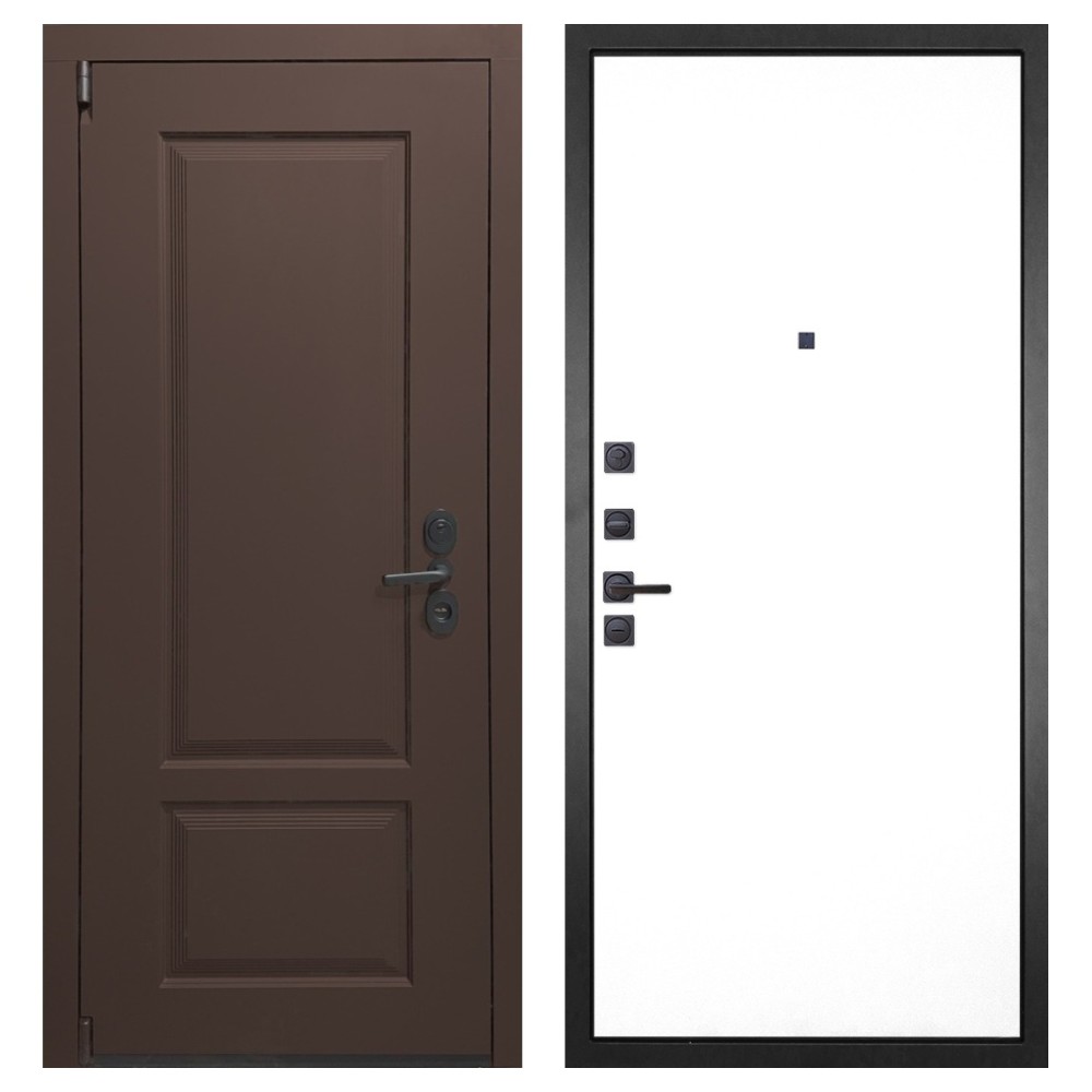 Прочность и надёжность: Стальное полотно (толщина 110–126 мм) из двух листов стали, усиленные петли БАРК и пять противосъёмных штырей делают дверь максимально устойчивой к взлому.