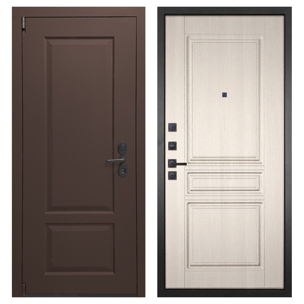 Прочность и надёжность: Стальное полотно (толщина 110–126 мм) из двух листов стали, усиленные петли БАРК и пять противосъёмных штырей делают дверь максимально устойчивой к взлому.