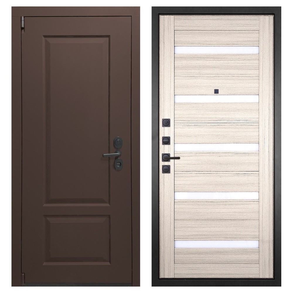 Функциональность: Задвижка «Ночной сторож», удлинённый глазок, усиленная ручка и фурнитура чёрного цвета добавляют удобства и стильности.
