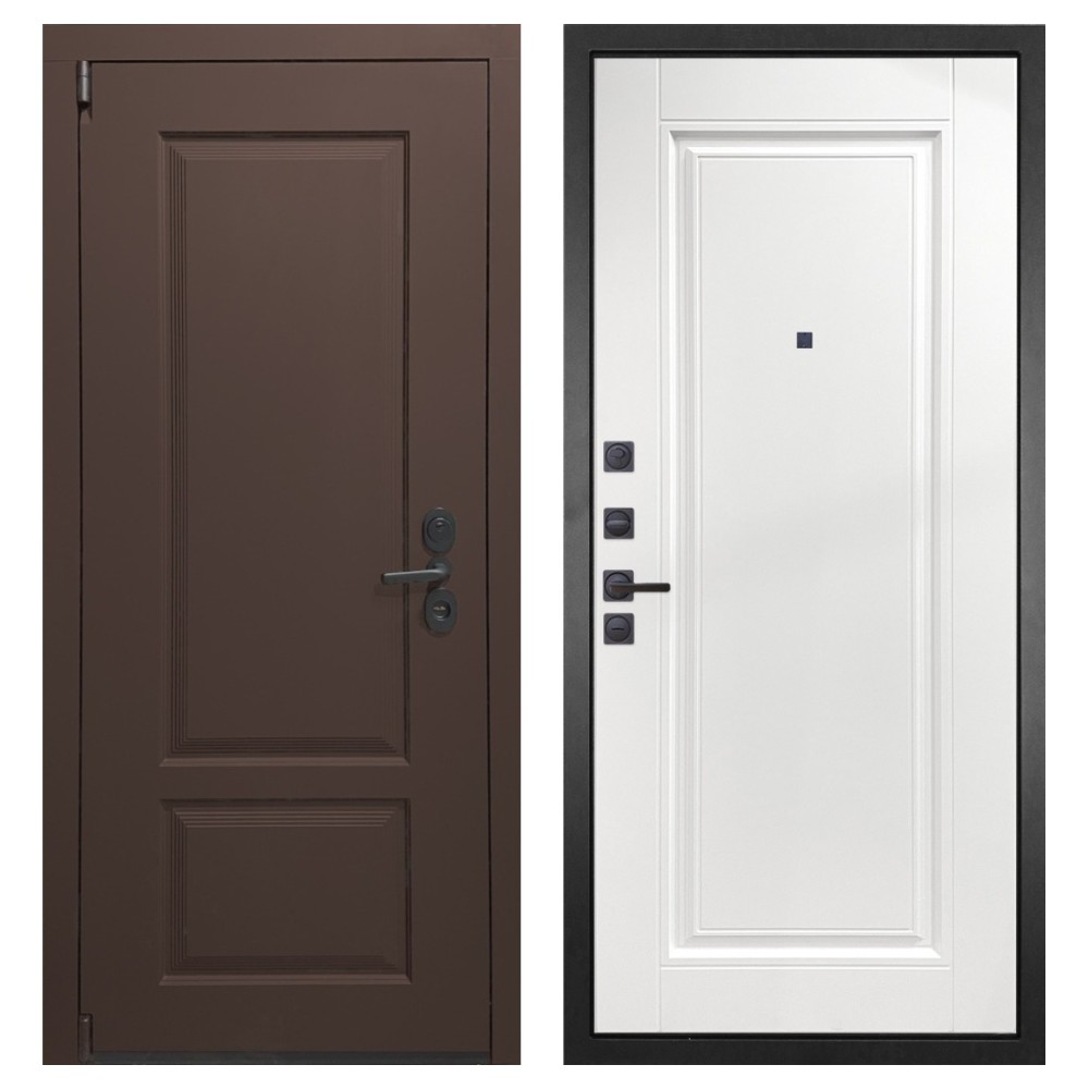 Прочность и надёжность: Стальное полотно (толщина 110–126 мм) из двух листов стали, усиленные петли БАРК и пять противосъёмных штырей делают дверь максимально устойчивой к взлому.