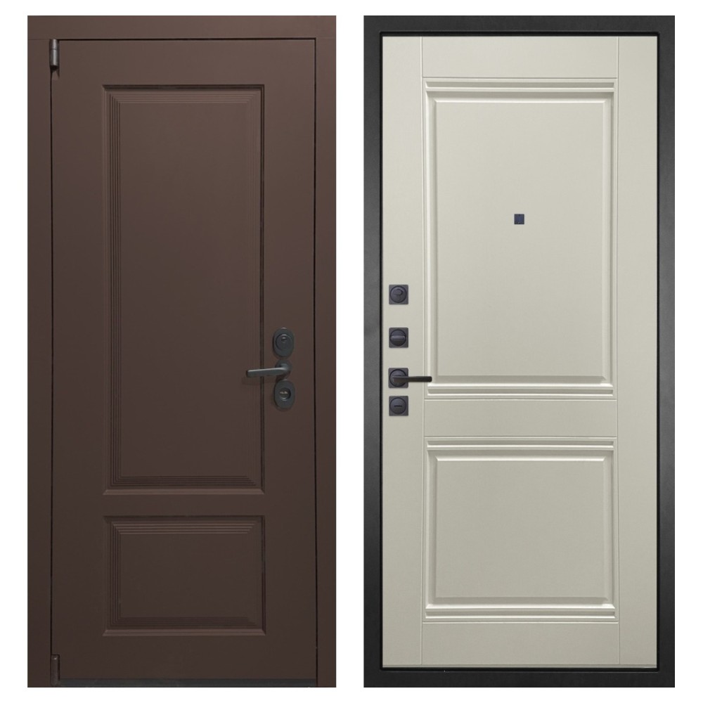 Прочность и надёжность: Стальное полотно (толщина 110–126 мм) из двух листов стали, усиленные петли БАРК и пять противосъёмных штырей делают дверь максимально устойчивой к взлому.