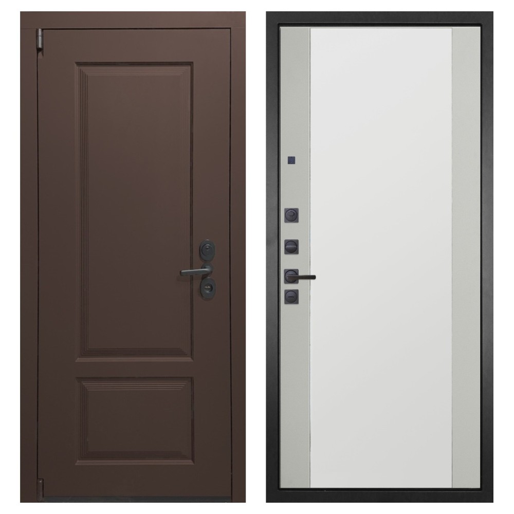 Прочность и надёжность: Стальное полотно (толщина 110–126 мм) из двух листов стали, усиленные петли БАРК и пять противосъёмных штырей делают дверь максимально устойчивой к взлому.