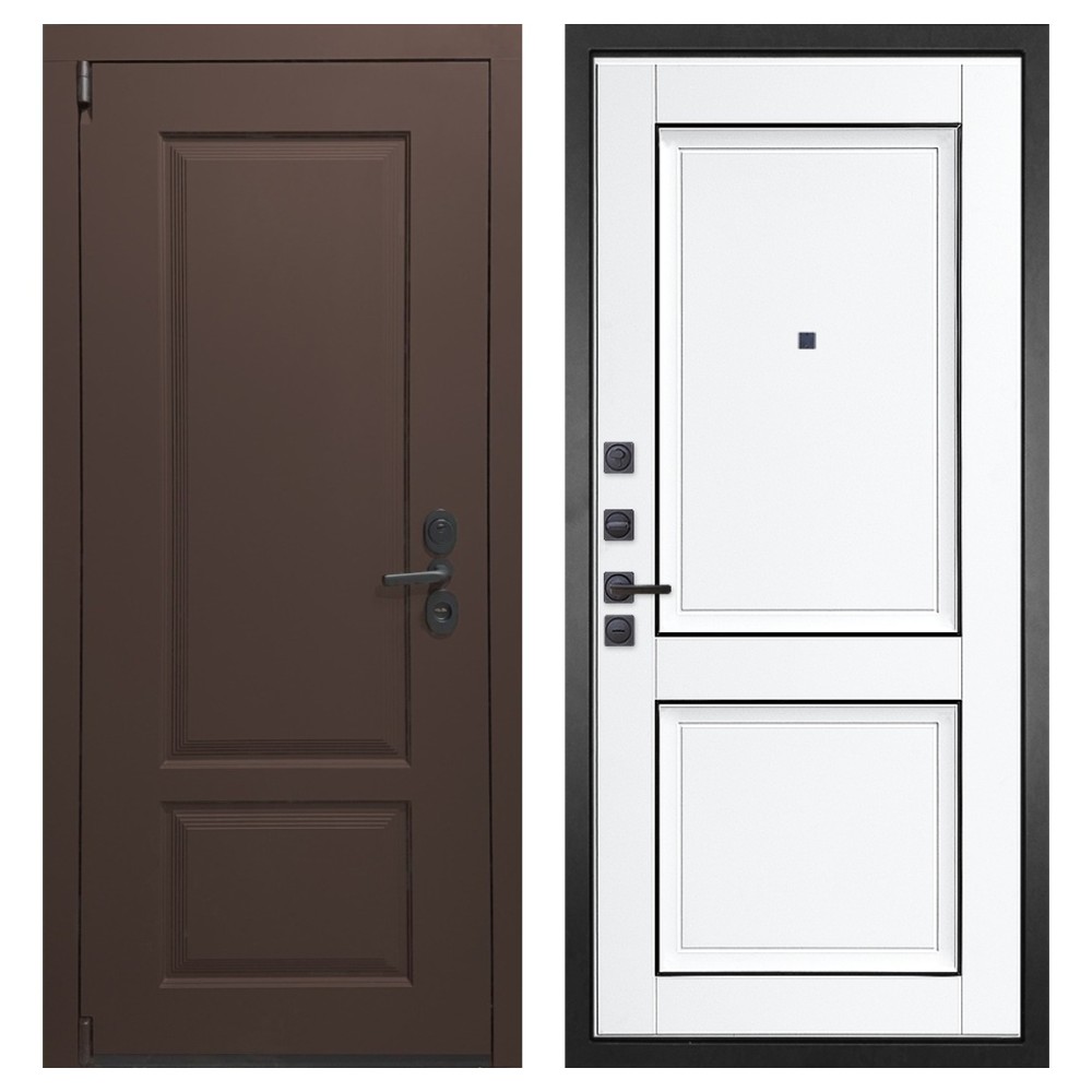Прочность и надёжность: Стальное полотно (толщина 110–126 мм) из двух листов стали, усиленные петли БАРК и пять противосъёмных штырей делают дверь максимально устойчивой к взлому.