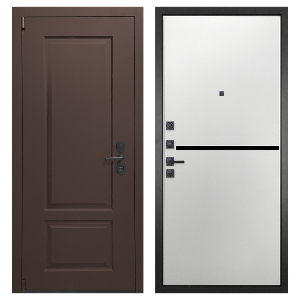 Прочность и надёжность: Стальное полотно (толщина 110–126 мм) из двух листов стали, усиленные петли БАРК и пять противосъёмных штырей делают дверь максимально устойчивой к взлому.