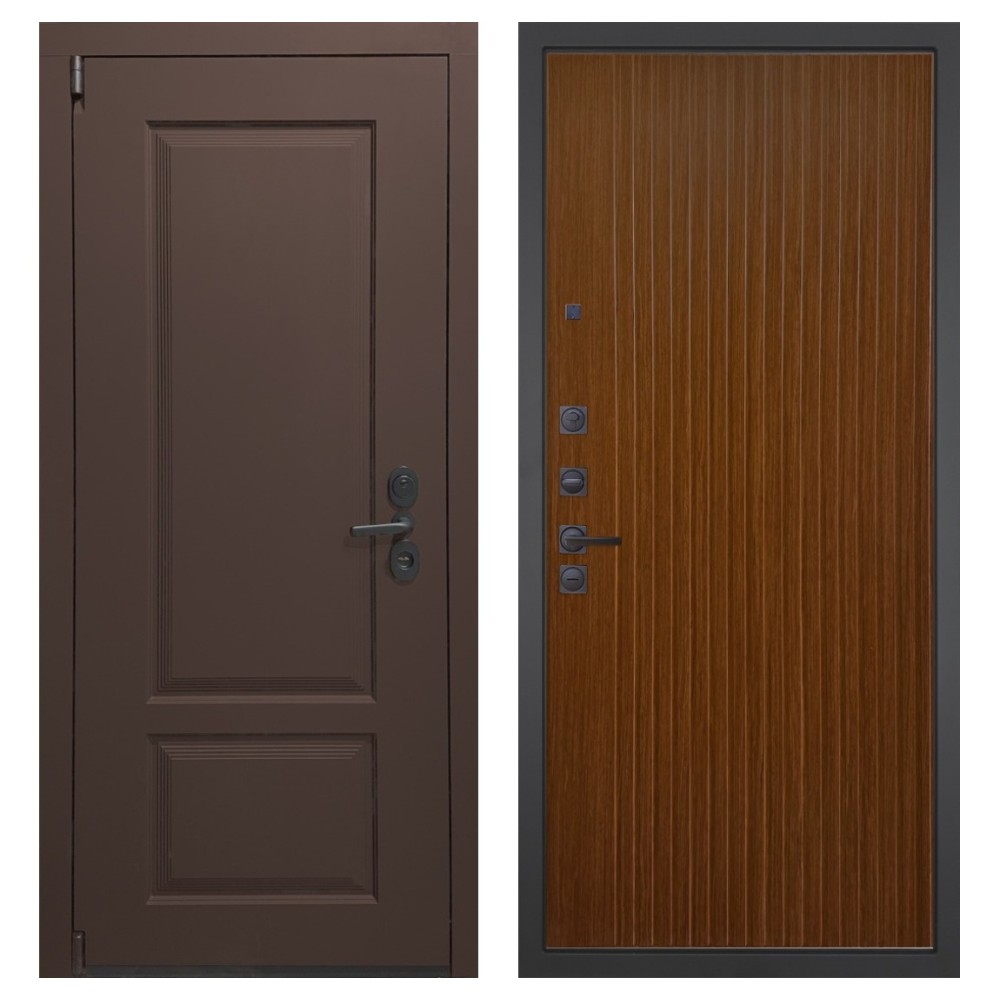 Прочность и надёжность: Стальное полотно (толщина 110–126 мм) из двух листов стали, усиленные петли БАРК и пять противосъёмных штырей делают дверь максимально устойчивой к взлому.