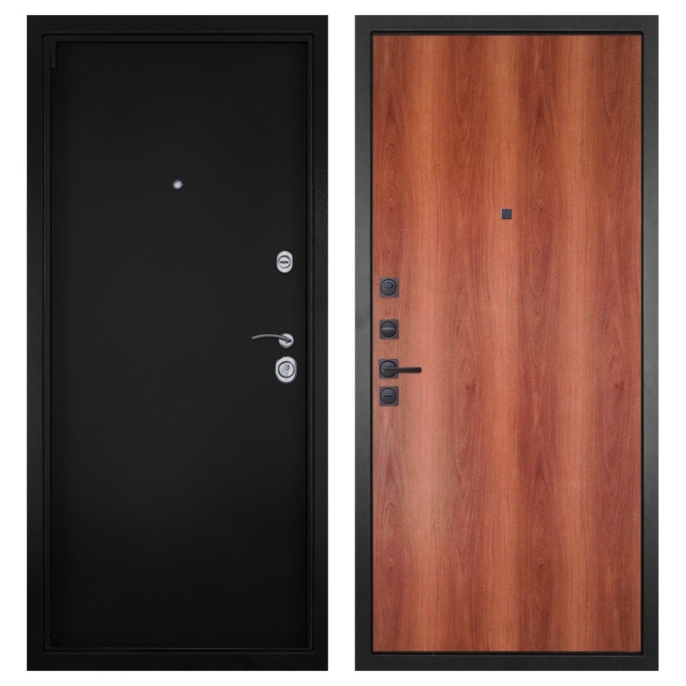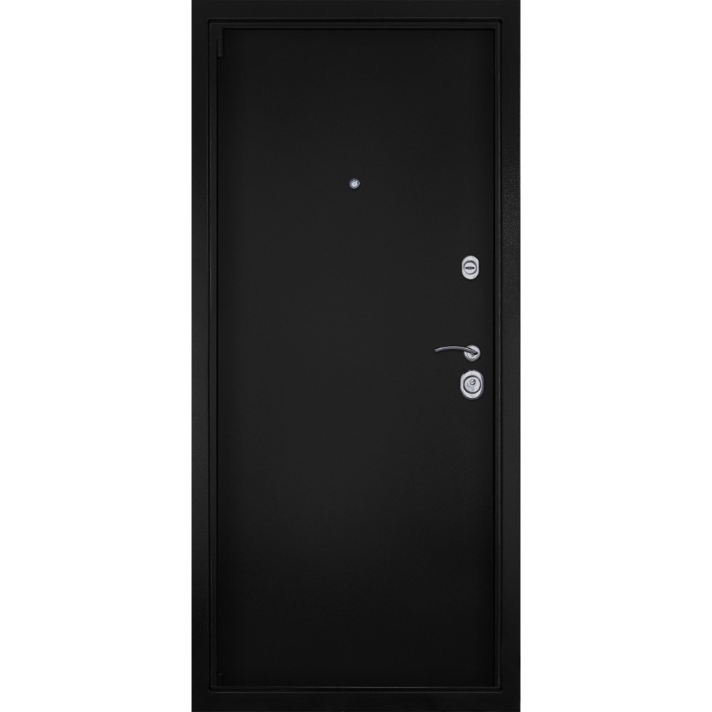 Дизайн и покрытие: Полимерно-порошковое покрытие цвета «Чёрная шагрень» придаёт двери современный и лаконичный вид. Два хромированных логотипа подчёркивают фирменный стиль.