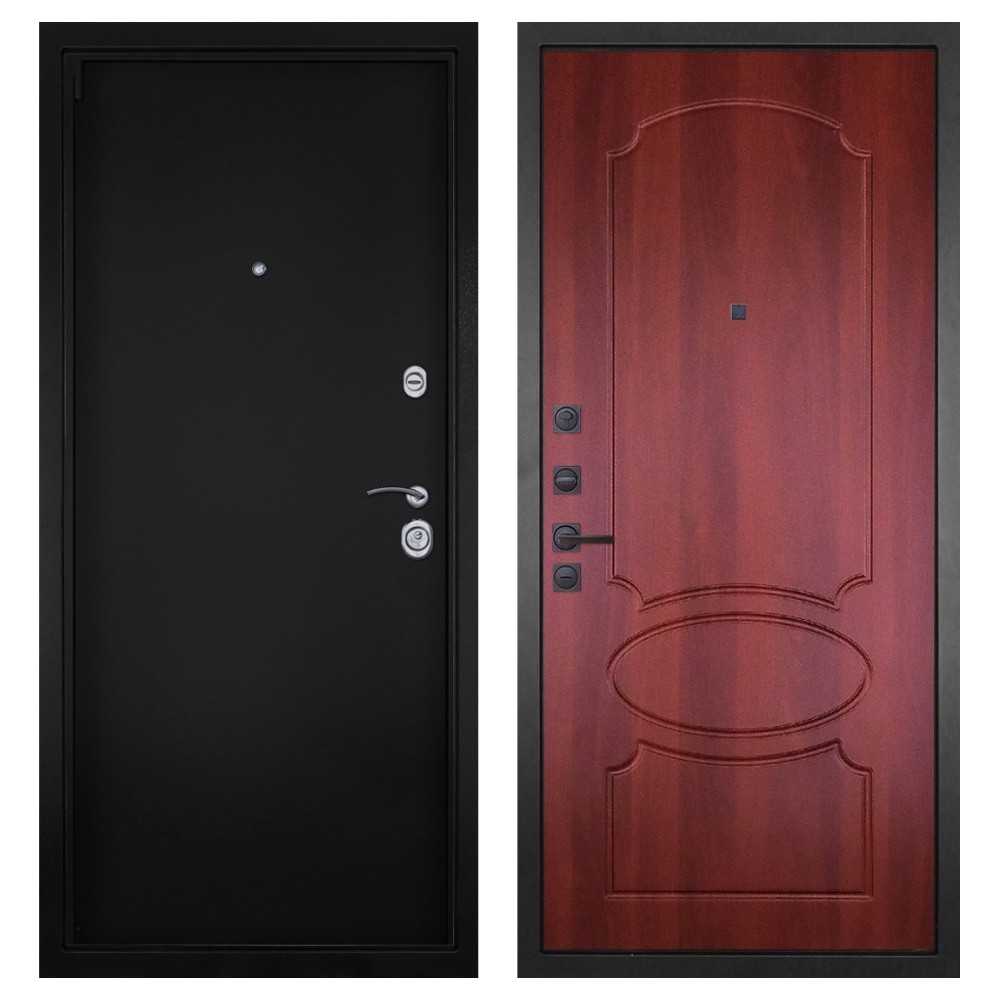 Дизайн и покрытие: Полимерно-порошковое покрытие цвета «Чёрная шагрень» придаёт двери современный и лаконичный вид. Два хромированных логотипа подчёркивают фирменный стиль.