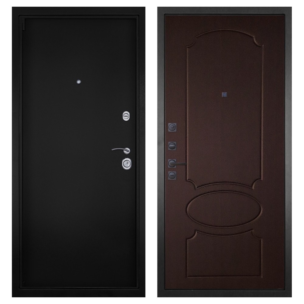 Дизайн и покрытие: Полимерно-порошковое покрытие цвета «Чёрная шагрень» придаёт двери современный и лаконичный вид. Два хромированных логотипа подчёркивают фирменный стиль.