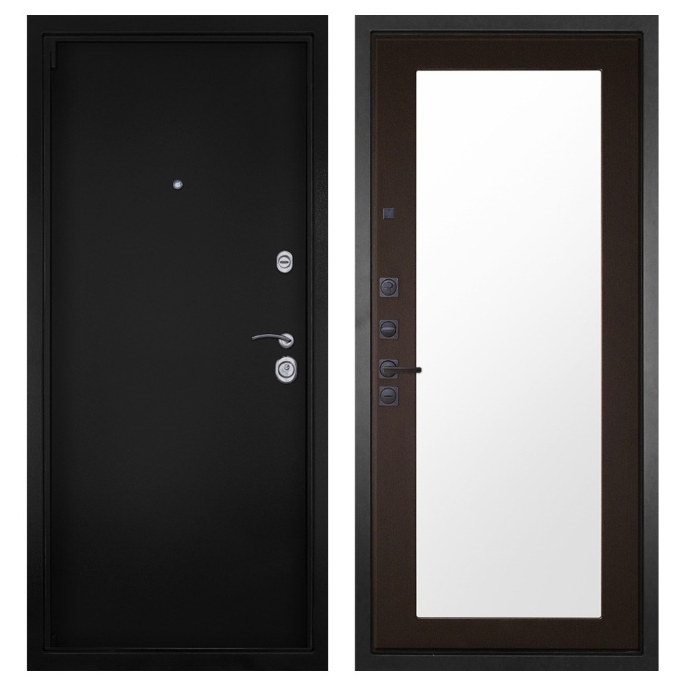 Дизайн и покрытие: Полимерно-порошковое покрытие цвета «Чёрная шагрень» придаёт двери современный и лаконичный вид. Два хромированных логотипа подчёркивают фирменный стиль.