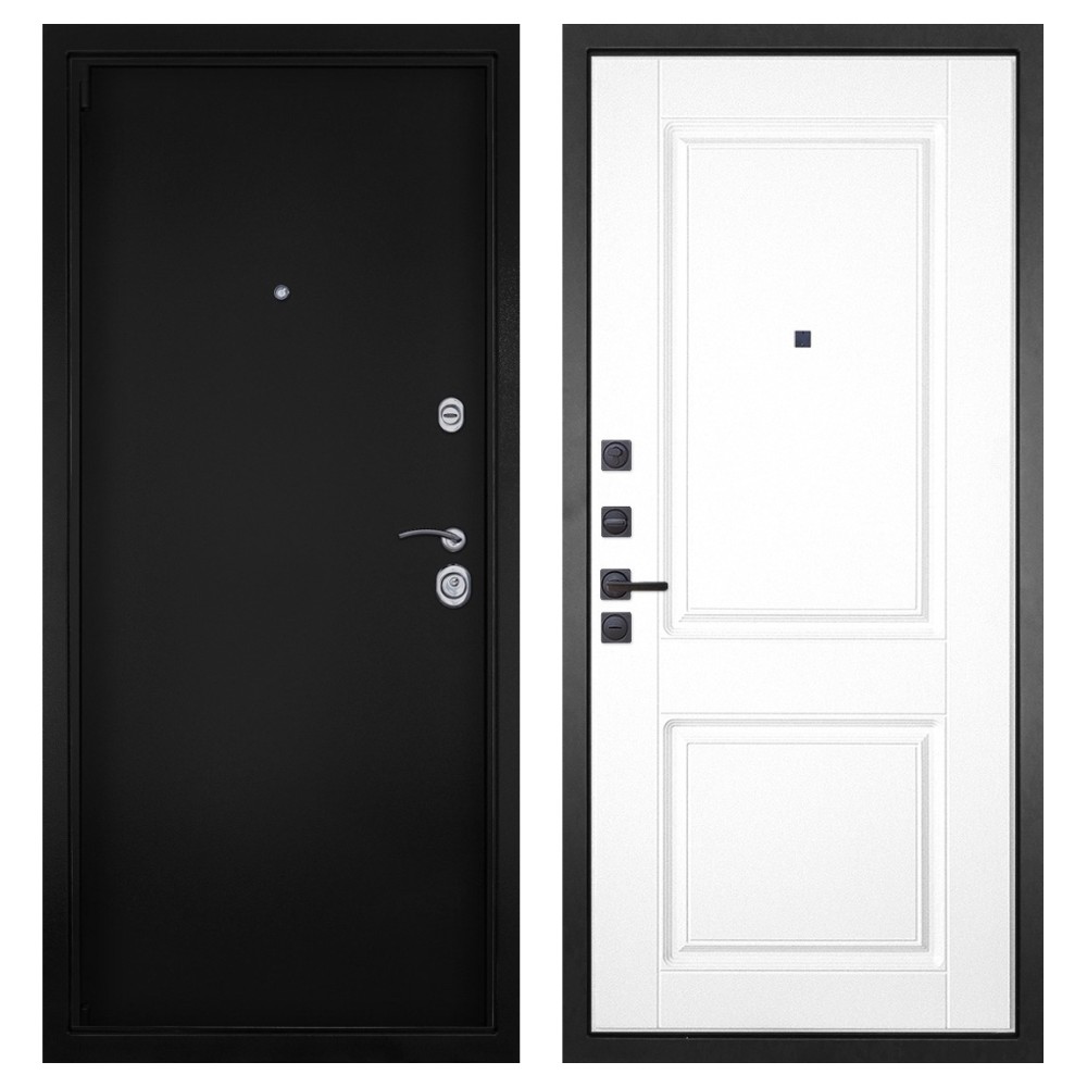 Дизайн и покрытие: Полимерно-порошковое покрытие цвета «Чёрная шагрень» придаёт двери современный и лаконичный вид. Два хромированных логотипа подчёркивают фирменный стиль.