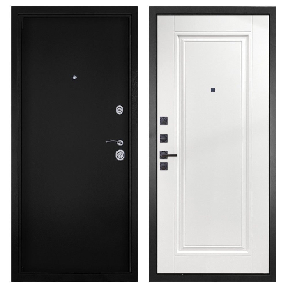 Дизайн и покрытие: Полимерно-порошковое покрытие цвета «Чёрная шагрень» придаёт двери современный и лаконичный вид. Два хромированных логотипа подчёркивают фирменный стиль.