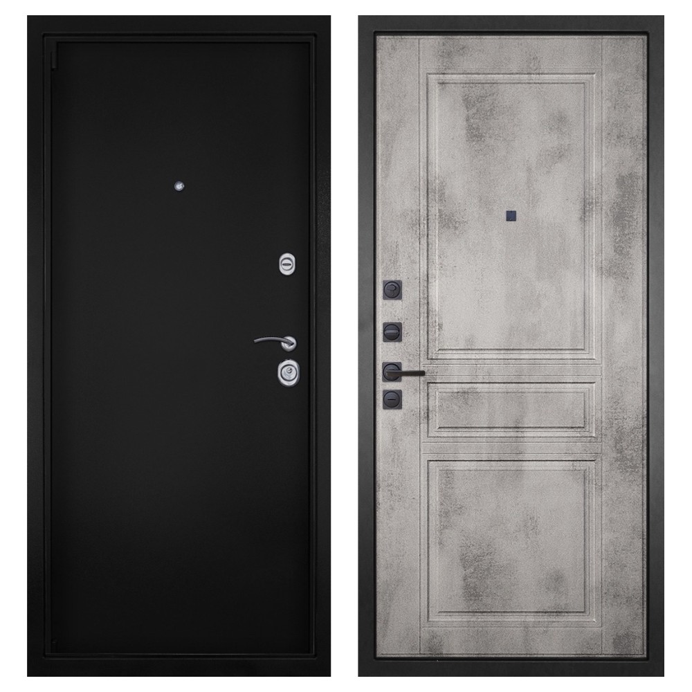 Дизайн и покрытие: Полимерно-порошковое покрытие цвета «Чёрная шагрень» придаёт двери современный и лаконичный вид. Два хромированных логотипа подчёркивают фирменный стиль.
