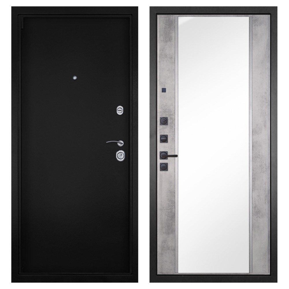 Дизайн и покрытие: Полимерно-порошковое покрытие цвета «Чёрная шагрень» придаёт двери современный и лаконичный вид. Два хромированных логотипа подчёркивают фирменный стиль.