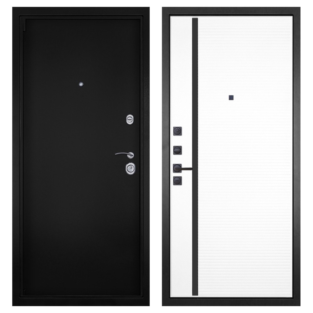 Дизайн и покрытие: Полимерно-порошковое покрытие цвета «Чёрная шагрень» придаёт двери современный и лаконичный вид. Два хромированных логотипа подчёркивают фирменный стиль.