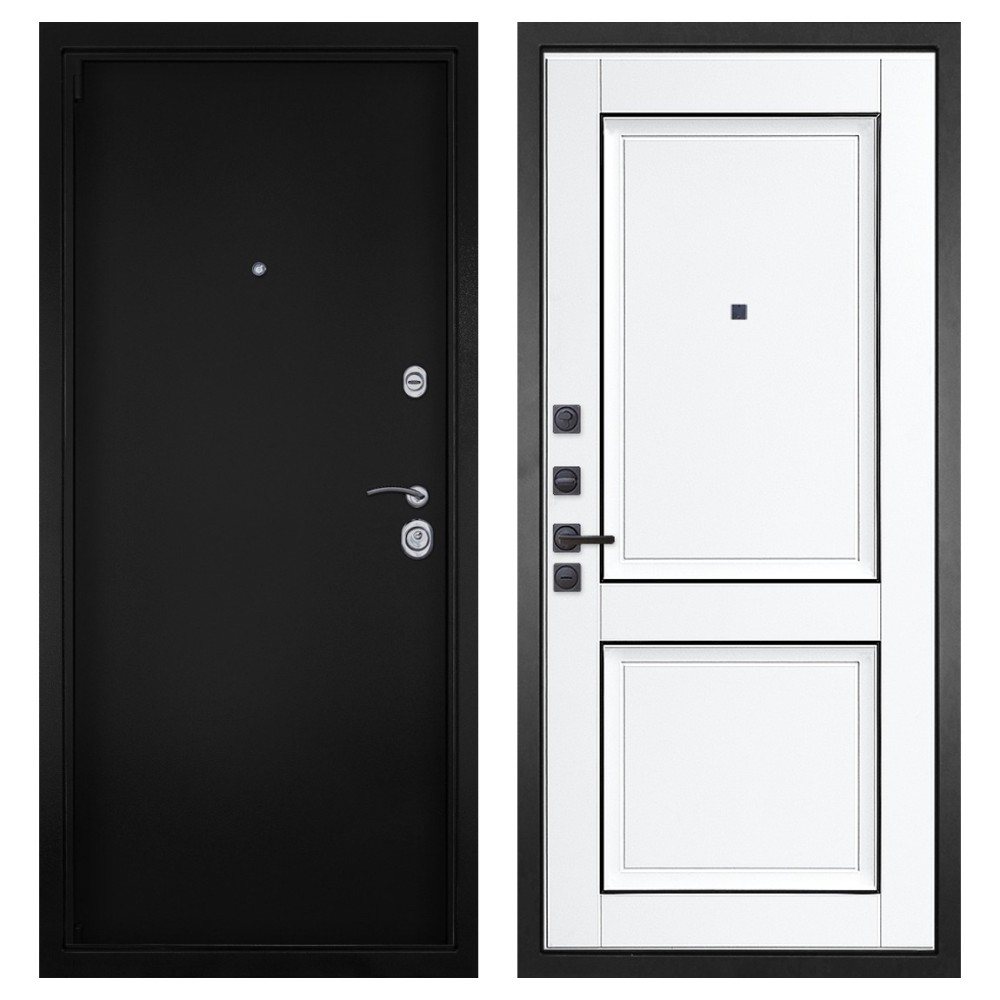 Дизайн и покрытие: Полимерно-порошковое покрытие цвета «Чёрная шагрень» придаёт двери современный и лаконичный вид. Два хромированных логотипа подчёркивают фирменный стиль.