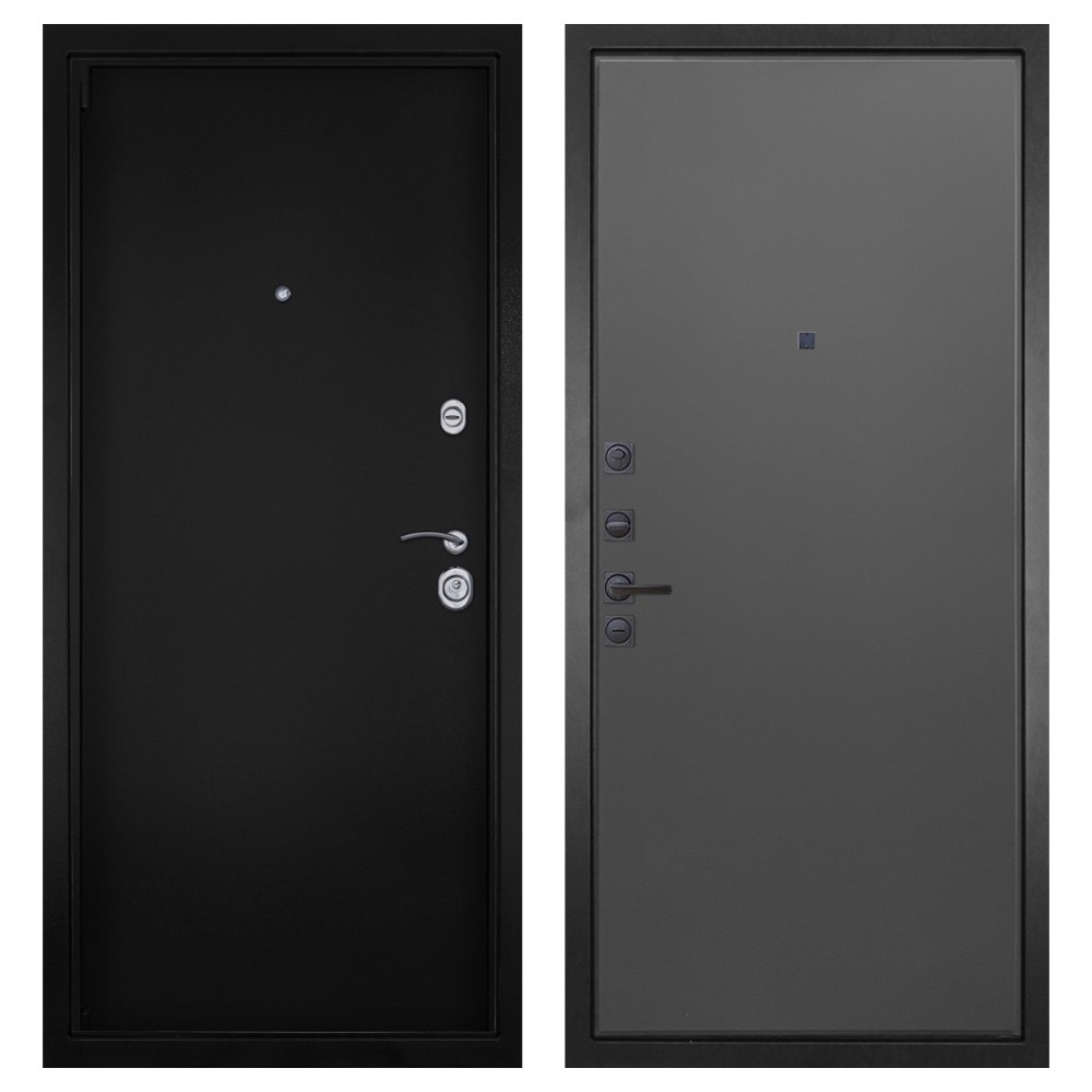 Дизайн и покрытие: Полимерно-порошковое покрытие цвета «Чёрная шагрень» придаёт двери современный и лаконичный вид. Два хромированных логотипа подчёркивают фирменный стиль.