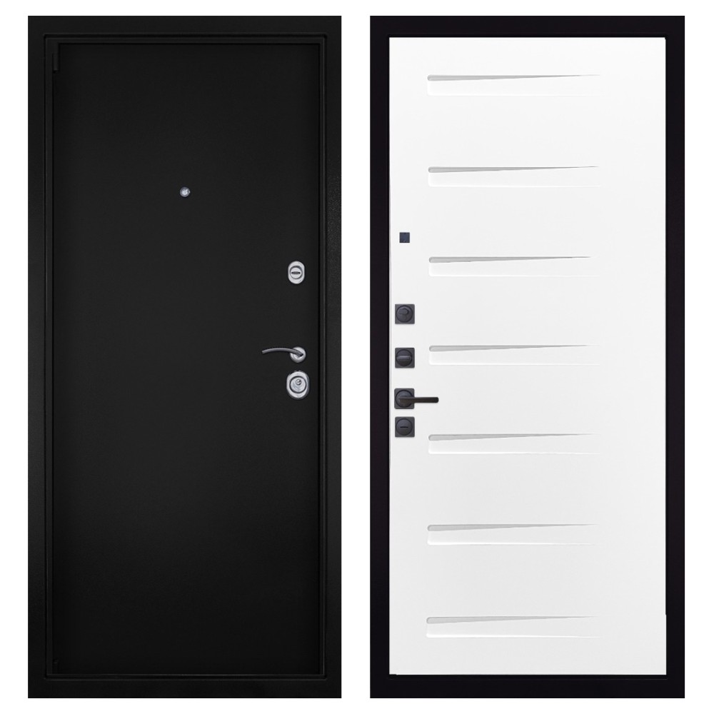 Дизайн и покрытие: Полимерно-порошковое покрытие цвета «Чёрная шагрень» придаёт двери современный и лаконичный вид. Два хромированных логотипа подчёркивают фирменный стиль.