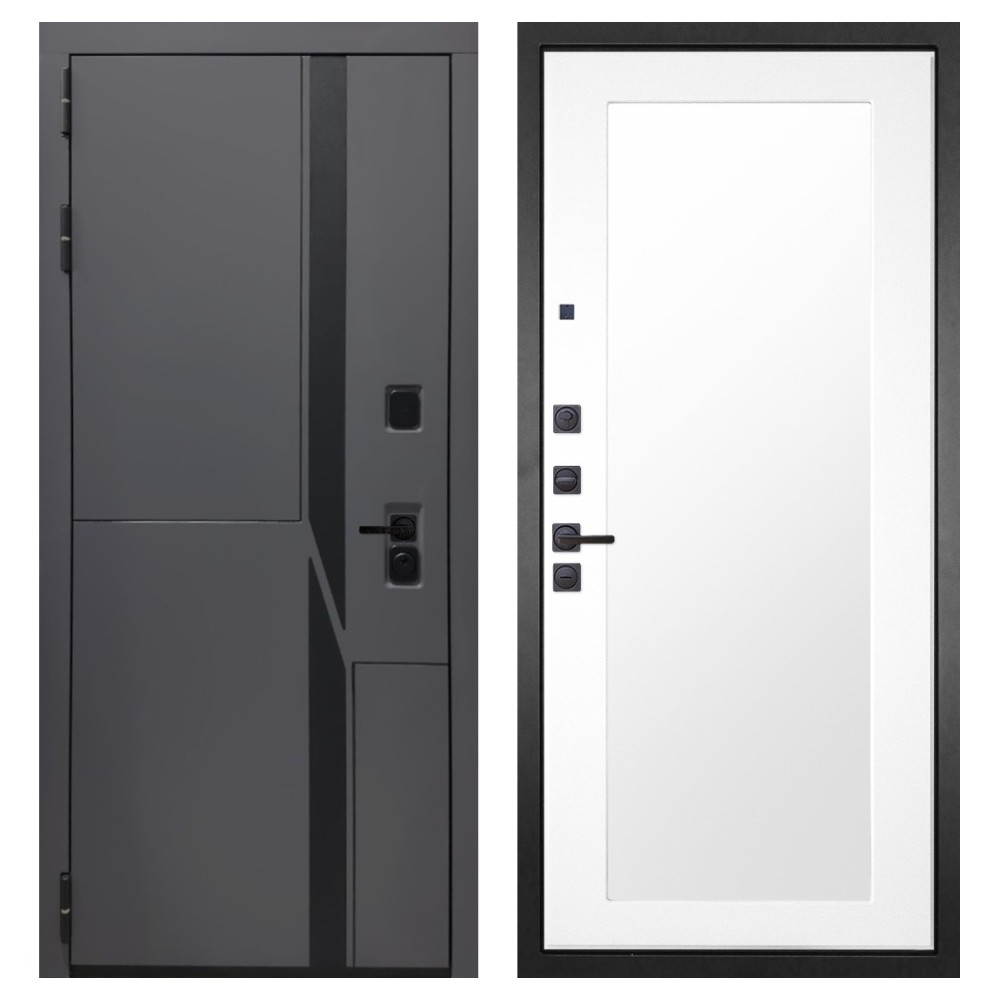Дизайн и отделка: Металлическая конструкция окрашена полимерно-порошковым покрытием цвета «Муар чёрный», устойчивым к повреждениям и коррозии. Внешняя МДФ-панель и наличники выполнены в цвете «Шагрень графит» толщиной 10 мм — стильное решение, подчёркивающее современный минимализм. Чёрная фурнитура гармонично дополняет общий облик двери.