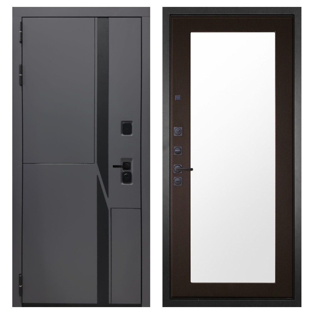Дизайн и отделка: Металлическая конструкция окрашена полимерно-порошковым покрытием цвета «Муар чёрный», устойчивым к повреждениям и коррозии. Внешняя МДФ-панель и наличники выполнены в цвете «Шагрень графит» толщиной 10 мм — стильное решение, подчёркивающее современный минимализм. Чёрная фурнитура гармонично дополняет общий облик двери.