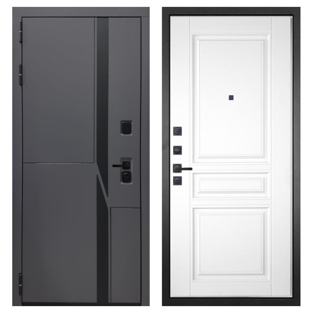 Дизайн и отделка: Металлическая конструкция окрашена полимерно-порошковым покрытием цвета «Муар чёрный», устойчивым к повреждениям и коррозии. Внешняя МДФ-панель и наличники выполнены в цвете «Шагрень графит» толщиной 10 мм — стильное решение, подчёркивающее современный минимализм. Чёрная фурнитура гармонично дополняет общий облик двери.