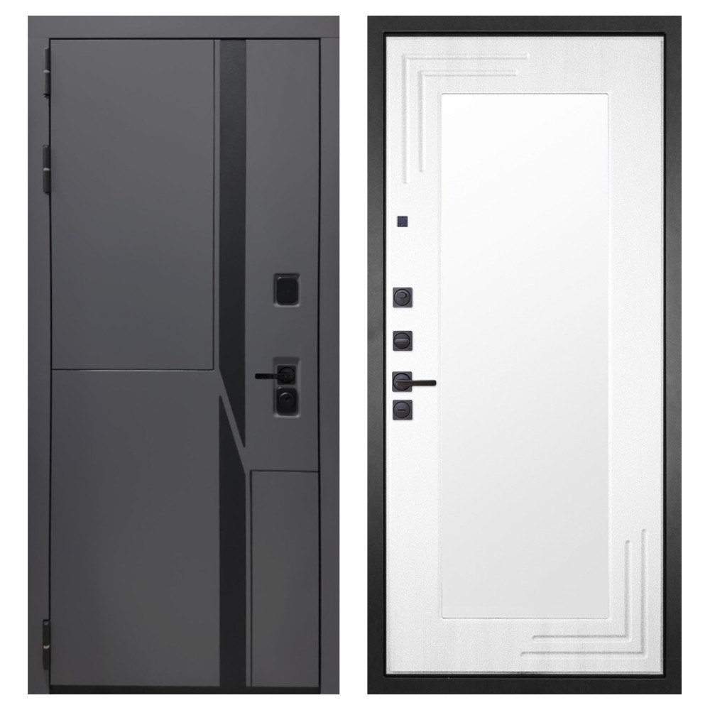Дизайн и отделка: Металлическая конструкция окрашена полимерно-порошковым покрытием цвета «Муар чёрный», устойчивым к повреждениям и коррозии. Внешняя МДФ-панель и наличники выполнены в цвете «Шагрень графит» толщиной 10 мм — стильное решение, подчёркивающее современный минимализм. Чёрная фурнитура гармонично дополняет общий облик двери.