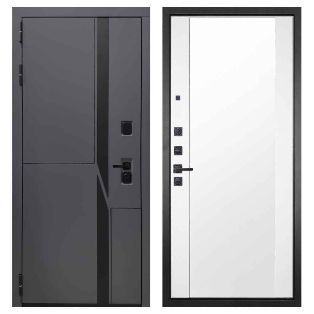 Дизайн и отделка: Металлическая конструкция окрашена полимерно-порошковым покрытием цвета «Муар чёрный», устойчивым к повреждениям и коррозии. Внешняя МДФ-панель и наличники выполнены в цвете «Шагрень графит» толщиной 10 мм — стильное решение, подчёркивающее современный минимализм. Чёрная фурнитура гармонично дополняет общий облик двери.