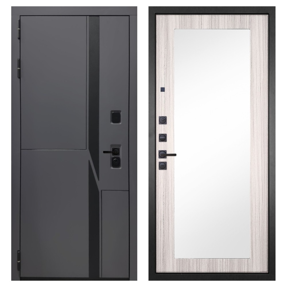 Дизайн и отделка: Металлическая конструкция окрашена полимерно-порошковым покрытием цвета «Муар чёрный», устойчивым к повреждениям и коррозии. Внешняя МДФ-панель и наличники выполнены в цвете «Шагрень графит» толщиной 10 мм — стильное решение, подчёркивающее современный минимализм. Чёрная фурнитура гармонично дополняет общий облик двери.
