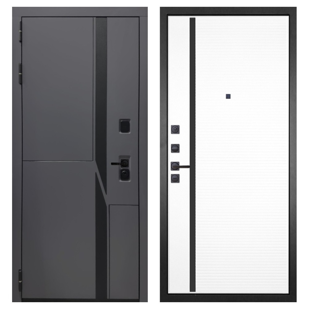 Дизайн и отделка: Металлическая конструкция окрашена полимерно-порошковым покрытием цвета «Муар чёрный», устойчивым к повреждениям и коррозии. Внешняя МДФ-панель и наличники выполнены в цвете «Шагрень графит» толщиной 10 мм — стильное решение, подчёркивающее современный минимализм. Чёрная фурнитура гармонично дополняет общий облик двери.