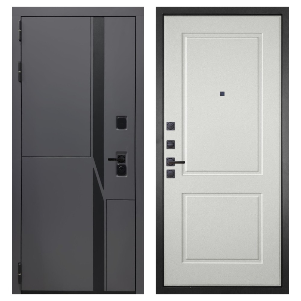 Дизайн и отделка: Металлическая конструкция окрашена полимерно-порошковым покрытием цвета «Муар чёрный», устойчивым к повреждениям и коррозии. Внешняя МДФ-панель и наличники выполнены в цвете «Шагрень графит» толщиной 10 мм — стильное решение, подчёркивающее современный минимализм. Чёрная фурнитура гармонично дополняет общий облик двери.
