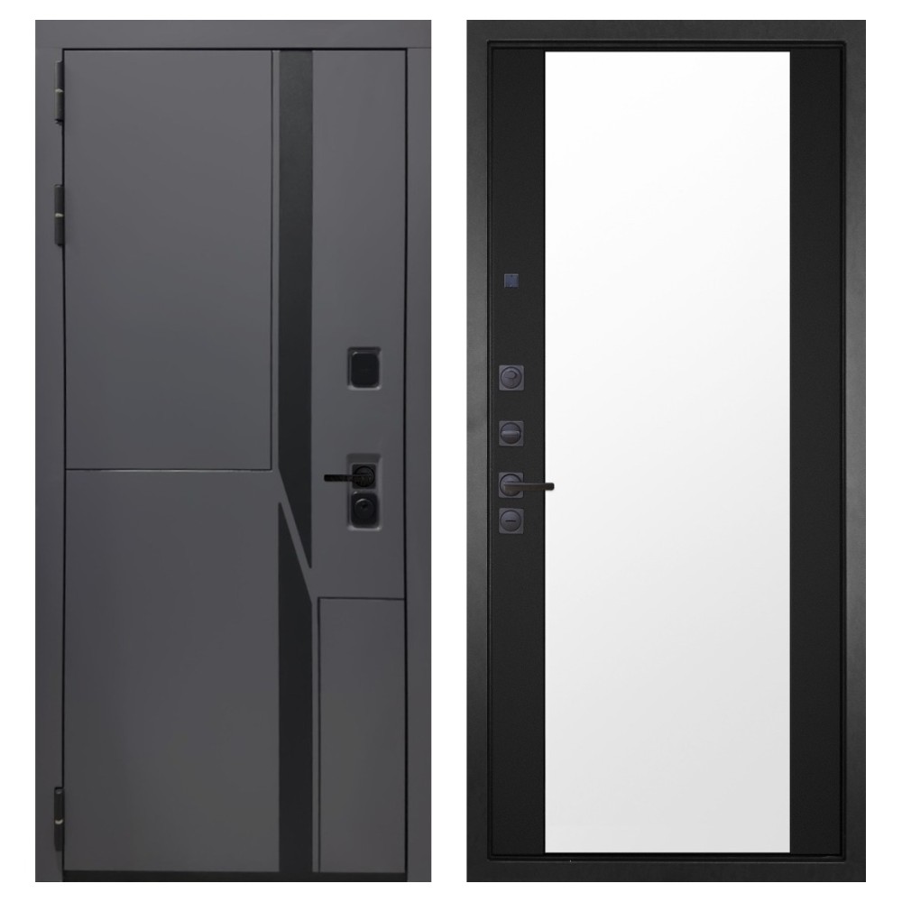 Дизайн и отделка: Металлическая конструкция окрашена полимерно-порошковым покрытием цвета «Муар чёрный», устойчивым к повреждениям и коррозии. Внешняя МДФ-панель и наличники выполнены в цвете «Шагрень графит» толщиной 10 мм — стильное решение, подчёркивающее современный минимализм. Чёрная фурнитура гармонично дополняет общий облик двери.