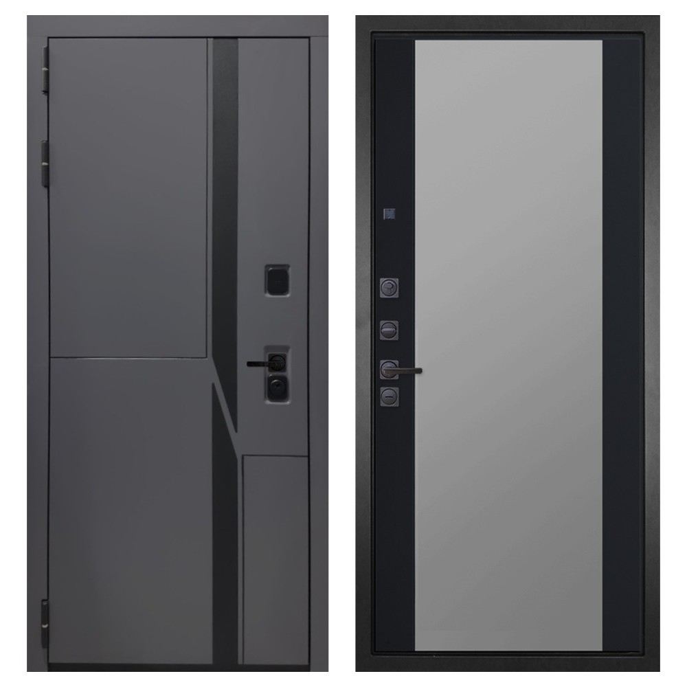 Дизайн и отделка: Металлическая конструкция окрашена полимерно-порошковым покрытием цвета «Муар чёрный», устойчивым к повреждениям и коррозии. Внешняя МДФ-панель и наличники выполнены в цвете «Шагрень графит» толщиной 10 мм — стильное решение, подчёркивающее современный минимализм. Чёрная фурнитура гармонично дополняет общий облик двери.
