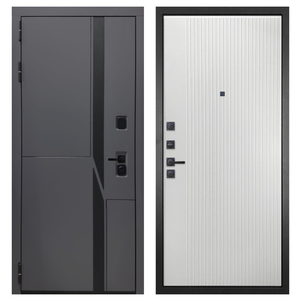 Дизайн и отделка: Металлическая конструкция окрашена полимерно-порошковым покрытием цвета «Муар чёрный», устойчивым к повреждениям и коррозии. Внешняя МДФ-панель и наличники выполнены в цвете «Шагрень графит» толщиной 10 мм — стильное решение, подчёркивающее современный минимализм. Чёрная фурнитура гармонично дополняет общий облик двери.