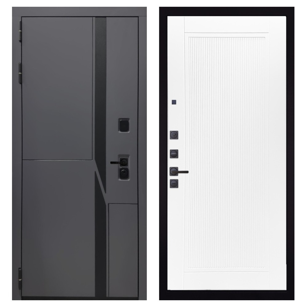 Дизайн и отделка: Металлическая конструкция окрашена полимерно-порошковым покрытием цвета «Муар чёрный», устойчивым к повреждениям и коррозии. Внешняя МДФ-панель и наличники выполнены в цвете «Шагрень графит» толщиной 10 мм — стильное решение, подчёркивающее современный минимализм. Чёрная фурнитура гармонично дополняет общий облик двери.