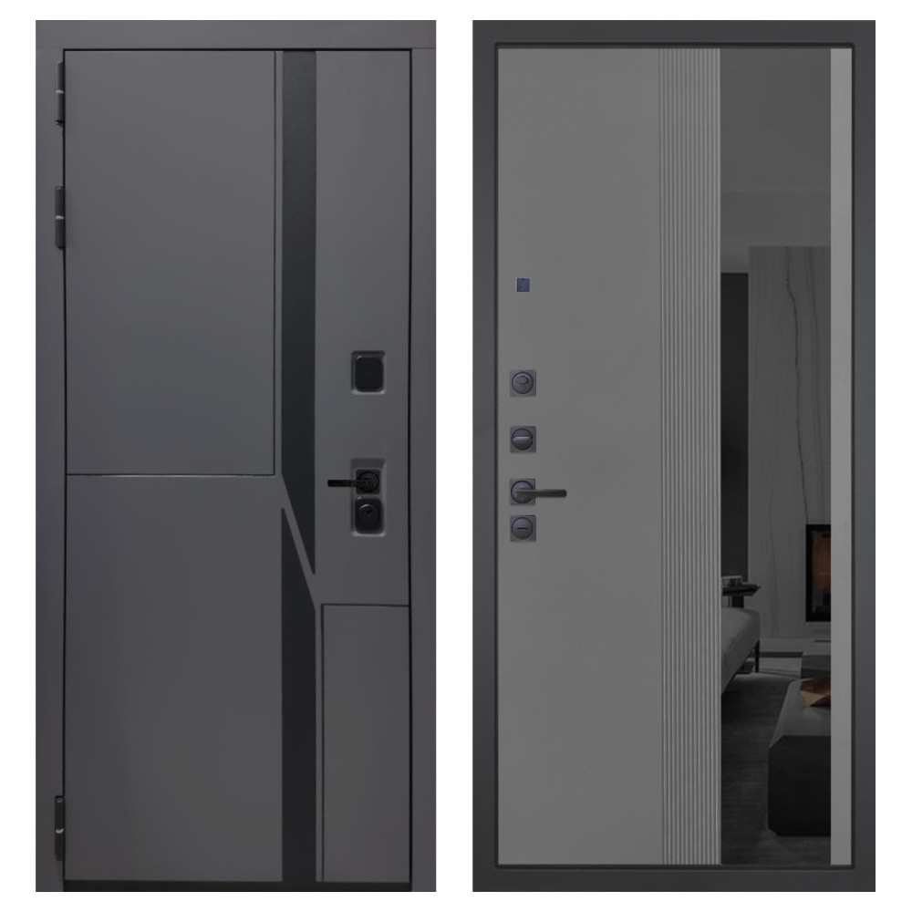 Дизайн и отделка: Металлическая конструкция окрашена полимерно-порошковым покрытием цвета «Муар чёрный», устойчивым к повреждениям и коррозии. Внешняя МДФ-панель и наличники выполнены в цвете «Шагрень графит» толщиной 10 мм — стильное решение, подчёркивающее современный минимализм. Чёрная фурнитура гармонично дополняет общий облик двери.