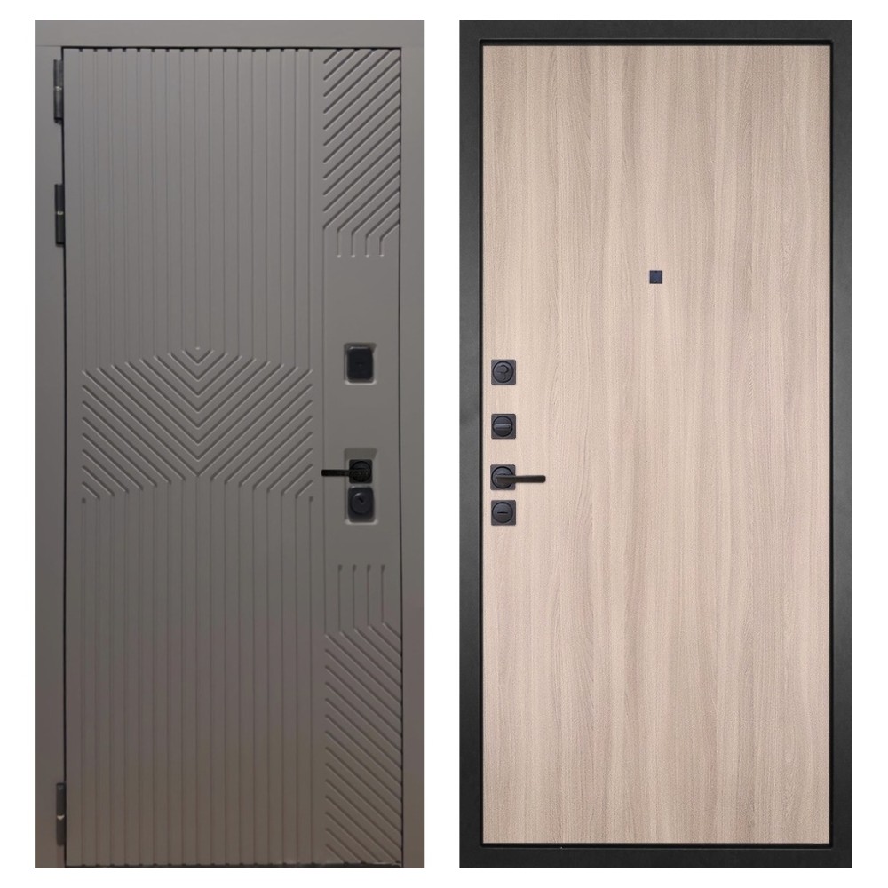 Дизайн и отделка: Металлическая конструкция окрашена полимерно-порошковым покрытием цвета «Муар чёрный». Внешняя МДФ-панель и наличники выполнены в цвете «Смоки софт» толщиной 10 мм — современное сочетание фактуры и оттенка, создающее стильный внешний вид. Чёрная фурнитура подчёркивает лаконичный характер модели.