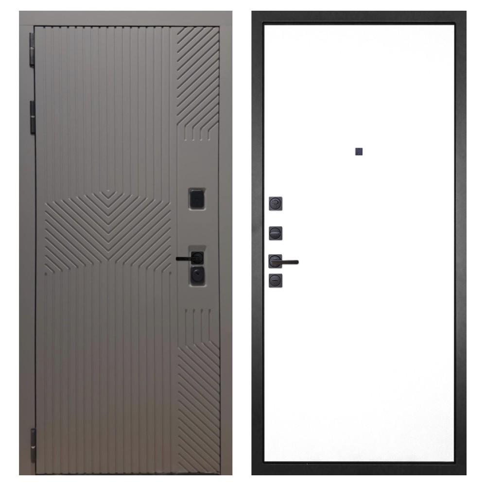 Дизайн и отделка: Металлическая конструкция окрашена полимерно-порошковым покрытием цвета «Муар чёрный». Внешняя МДФ-панель и наличники выполнены в цвете «Смоки софт» толщиной 10 мм — современное сочетание фактуры и оттенка, создающее стильный внешний вид. Чёрная фурнитура подчёркивает лаконичный характер модели.