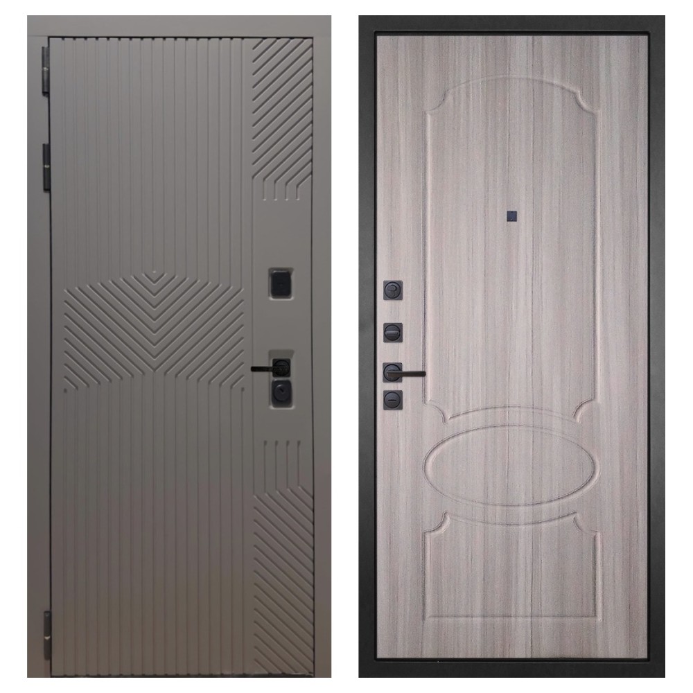 Дизайн и отделка: Металлическая конструкция окрашена полимерно-порошковым покрытием цвета «Муар чёрный». Внешняя МДФ-панель и наличники выполнены в цвете «Смоки софт» толщиной 10 мм — современное сочетание фактуры и оттенка, создающее стильный внешний вид. Чёрная фурнитура подчёркивает лаконичный характер модели.