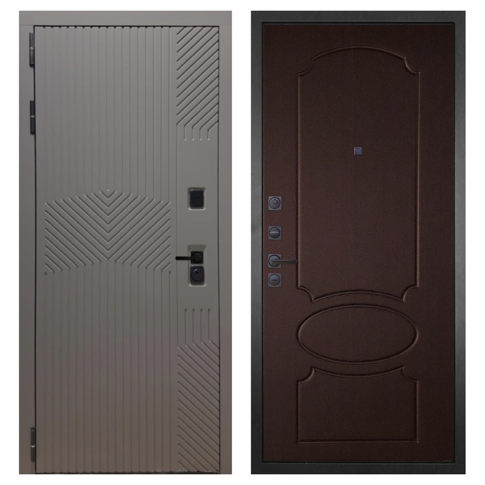 Дизайн и отделка: Металлическая конструкция окрашена полимерно-порошковым покрытием цвета «Муар чёрный». Внешняя МДФ-панель и наличники выполнены в цвете «Смоки софт» толщиной 10 мм — современное сочетание фактуры и оттенка, создающее стильный внешний вид. Чёрная фурнитура подчёркивает лаконичный характер модели.