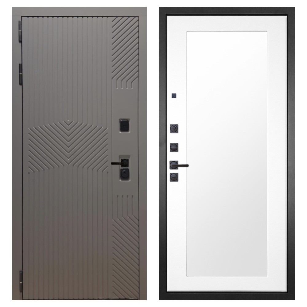Дизайн и отделка: Металлическая конструкция окрашена полимерно-порошковым покрытием цвета «Муар чёрный». Внешняя МДФ-панель и наличники выполнены в цвете «Смоки софт» толщиной 10 мм — современное сочетание фактуры и оттенка, создающее стильный внешний вид. Чёрная фурнитура подчёркивает лаконичный характер модели.