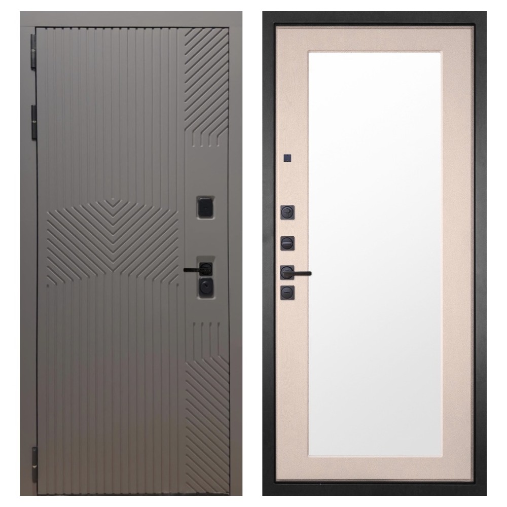 Дизайн и отделка: Металлическая конструкция окрашена полимерно-порошковым покрытием цвета «Муар чёрный». Внешняя МДФ-панель и наличники выполнены в цвете «Смоки софт» толщиной 10 мм — современное сочетание фактуры и оттенка, создающее стильный внешний вид. Чёрная фурнитура подчёркивает лаконичный характер модели.