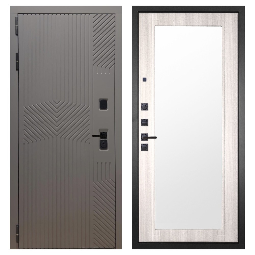 Дизайн и отделка: Металлическая конструкция окрашена полимерно-порошковым покрытием цвета «Муар чёрный». Внешняя МДФ-панель и наличники выполнены в цвете «Смоки софт» толщиной 10 мм — современное сочетание фактуры и оттенка, создающее стильный внешний вид. Чёрная фурнитура подчёркивает лаконичный характер модели.