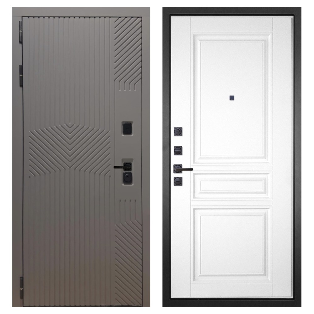 Дизайн и отделка: Металлическая конструкция окрашена полимерно-порошковым покрытием цвета «Муар чёрный». Внешняя МДФ-панель и наличники выполнены в цвете «Смоки софт» толщиной 10 мм — современное сочетание фактуры и оттенка, создающее стильный внешний вид. Чёрная фурнитура подчёркивает лаконичный характер модели.