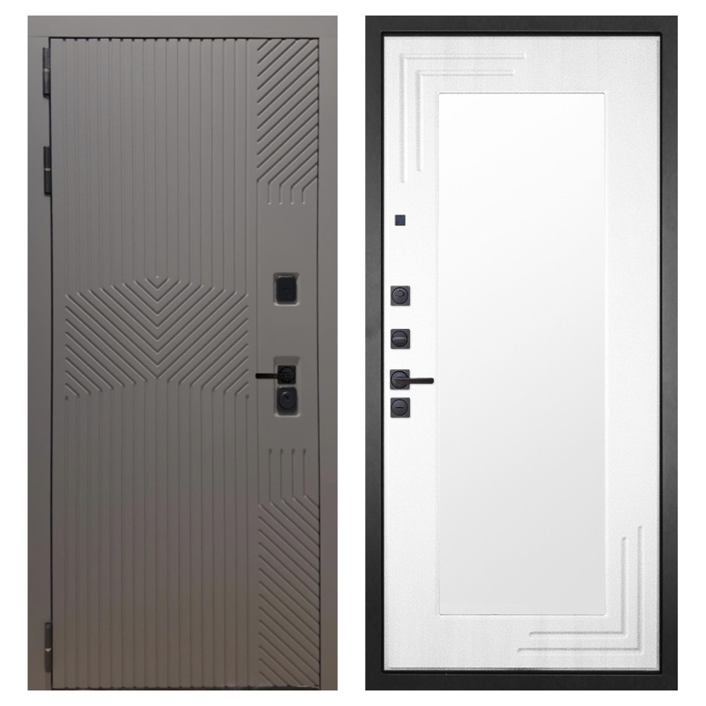 Дизайн и отделка: Металлическая конструкция окрашена полимерно-порошковым покрытием цвета «Муар чёрный». Внешняя МДФ-панель и наличники выполнены в цвете «Смоки софт» толщиной 10 мм — современное сочетание фактуры и оттенка, создающее стильный внешний вид. Чёрная фурнитура подчёркивает лаконичный характер модели.