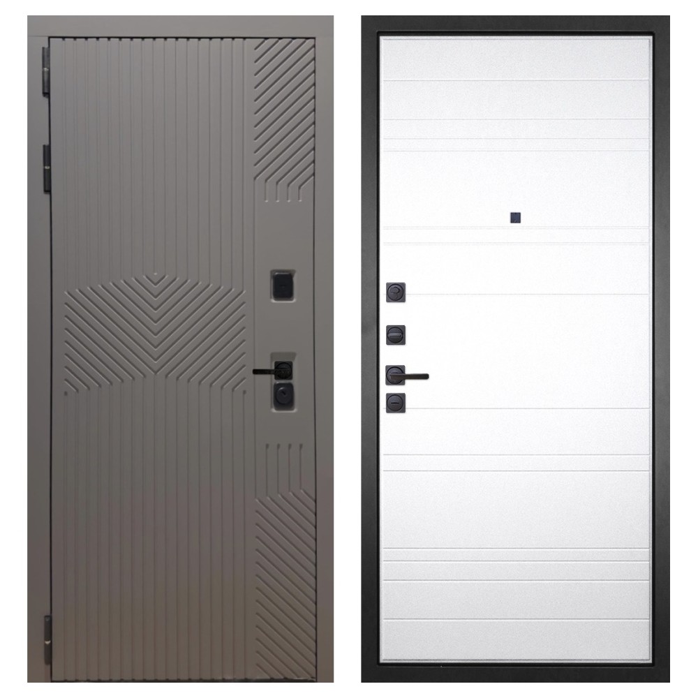 Дизайн и отделка: Металлическая конструкция окрашена полимерно-порошковым покрытием цвета «Муар чёрный». Внешняя МДФ-панель и наличники выполнены в цвете «Смоки софт» толщиной 10 мм — современное сочетание фактуры и оттенка, создающее стильный внешний вид. Чёрная фурнитура подчёркивает лаконичный характер модели.