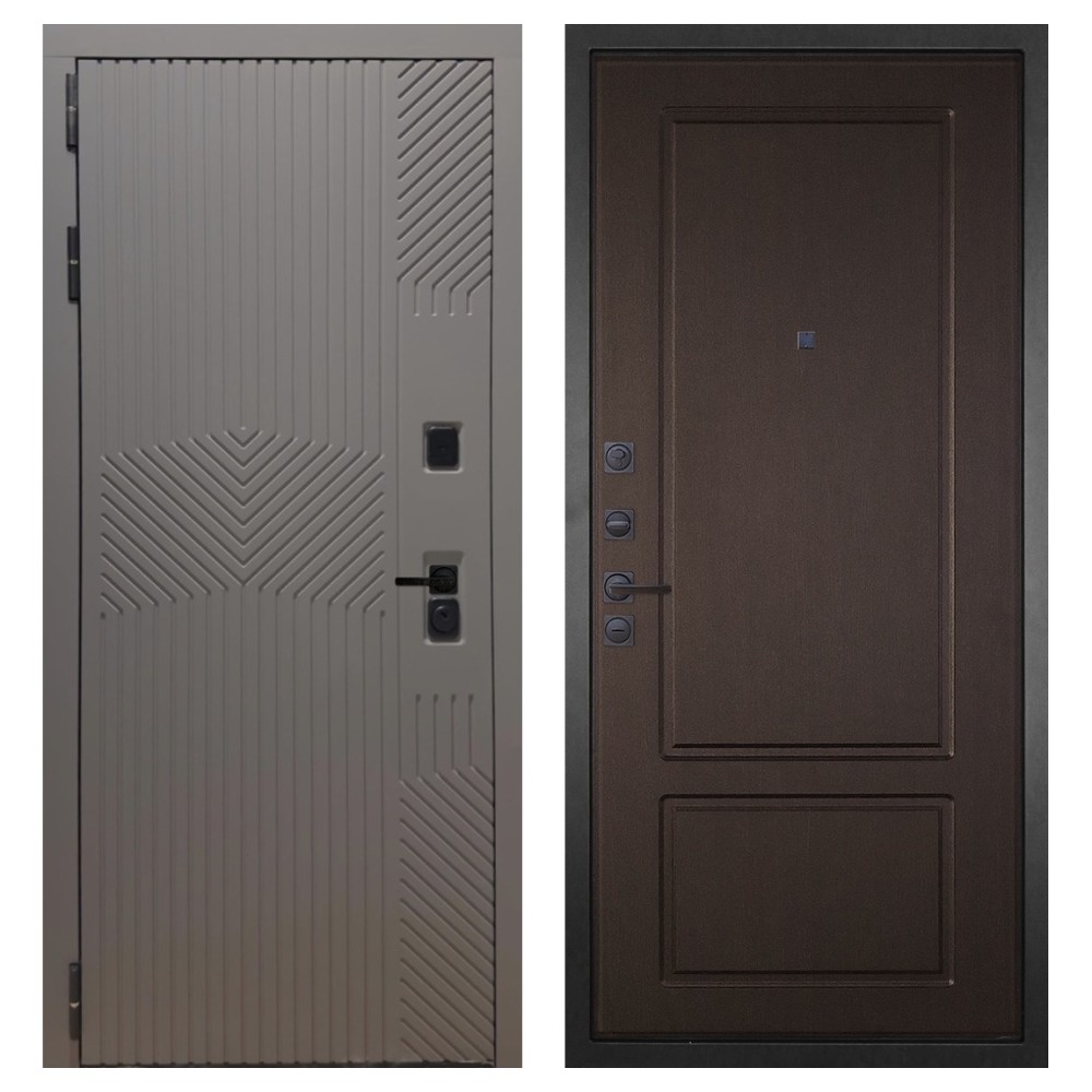 Дизайн и отделка: Металлическая конструкция окрашена полимерно-порошковым покрытием цвета «Муар чёрный». Внешняя МДФ-панель и наличники выполнены в цвете «Смоки софт» толщиной 10 мм — современное сочетание фактуры и оттенка, создающее стильный внешний вид. Чёрная фурнитура подчёркивает лаконичный характер модели.