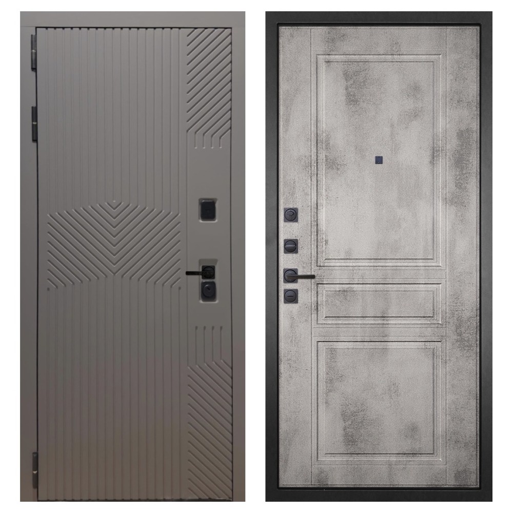 Дизайн и отделка: Металлическая конструкция окрашена полимерно-порошковым покрытием цвета «Муар чёрный». Внешняя МДФ-панель и наличники выполнены в цвете «Смоки софт» толщиной 10 мм — современное сочетание фактуры и оттенка, создающее стильный внешний вид. Чёрная фурнитура подчёркивает лаконичный характер модели.