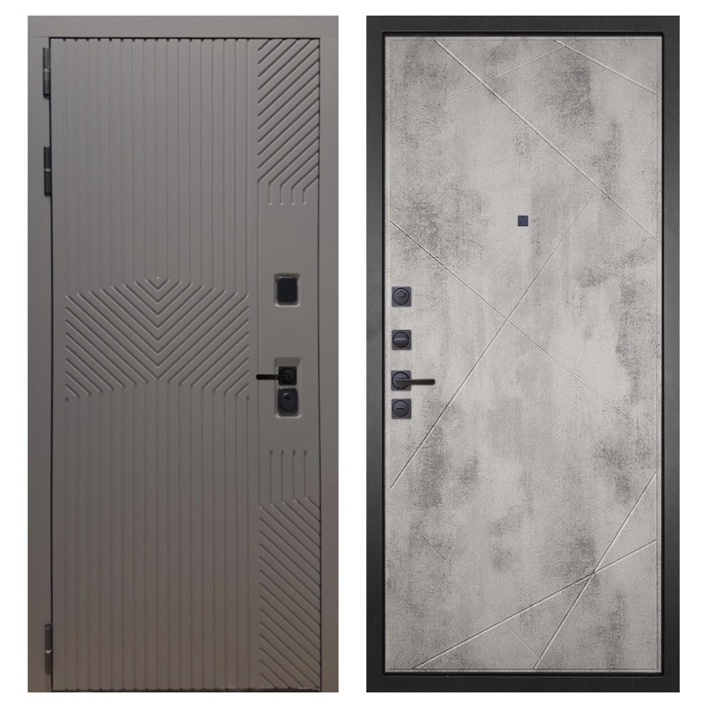 Дизайн и отделка: Металлическая конструкция окрашена полимерно-порошковым покрытием цвета «Муар чёрный». Внешняя МДФ-панель и наличники выполнены в цвете «Смоки софт» толщиной 10 мм — современное сочетание фактуры и оттенка, создающее стильный внешний вид. Чёрная фурнитура подчёркивает лаконичный характер модели.