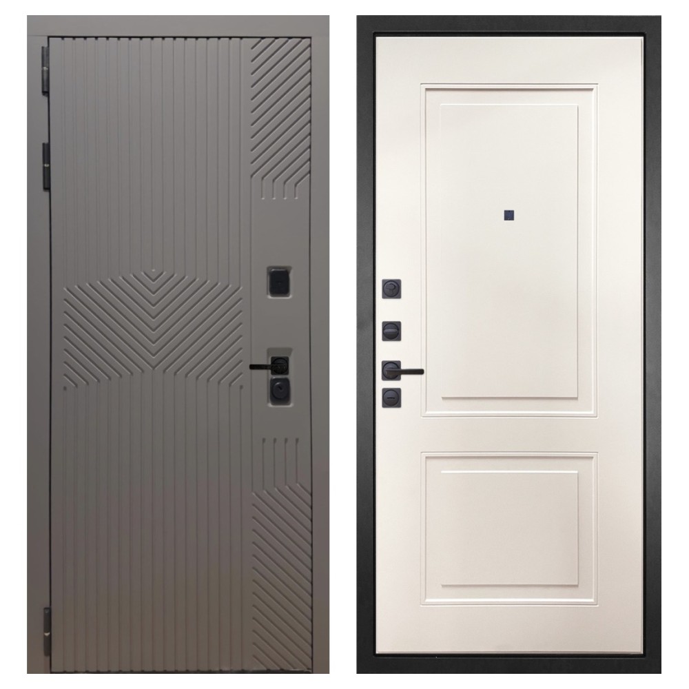 Дизайн и отделка: Металлическая конструкция окрашена полимерно-порошковым покрытием цвета «Муар чёрный». Внешняя МДФ-панель и наличники выполнены в цвете «Смоки софт» толщиной 10 мм — современное сочетание фактуры и оттенка, создающее стильный внешний вид. Чёрная фурнитура подчёркивает лаконичный характер модели.