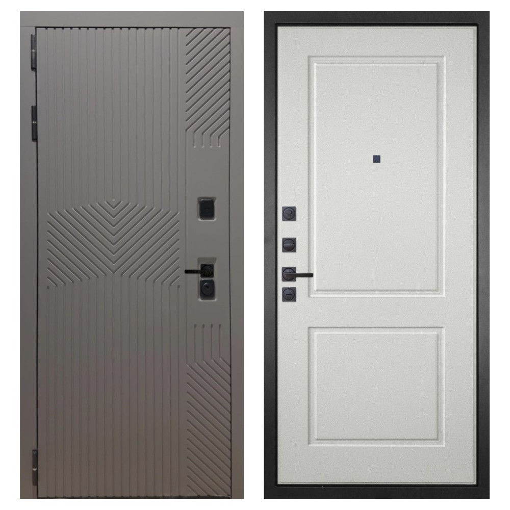 Дизайн и отделка: Металлическая конструкция окрашена полимерно-порошковым покрытием цвета «Муар чёрный». Внешняя МДФ-панель и наличники выполнены в цвете «Смоки софт» толщиной 10 мм — современное сочетание фактуры и оттенка, создающее стильный внешний вид. Чёрная фурнитура подчёркивает лаконичный характер модели.